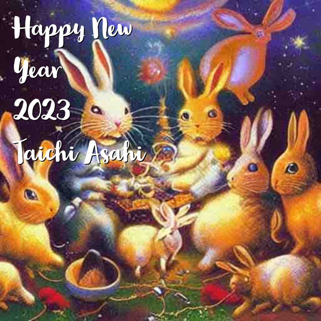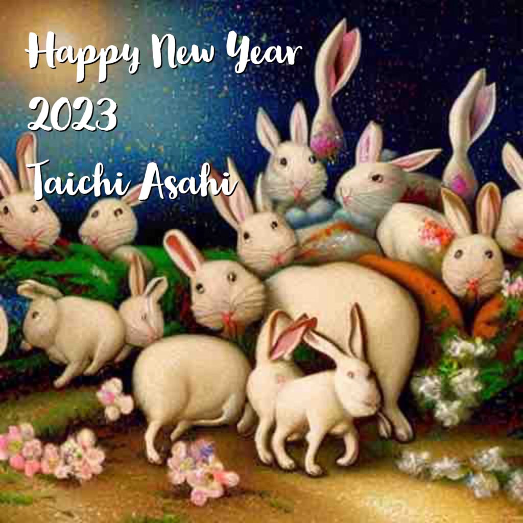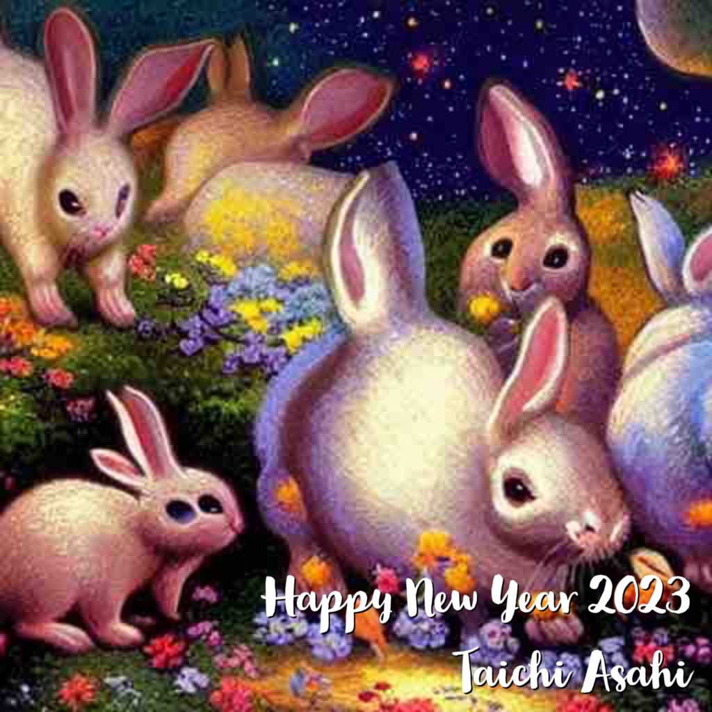 2023 Happy New Year 1 1月 2023 Diary あけましておめでとうございます。 でかい病気などをしたタイミングでブログの更新をしなくなってしまったが、久しぶりにSNSだけではなくてこちらの更新をしていくことにします。 気がつけばAIが当たり前になりそうな現在。年賀状はAIに書いてもらいました。テーマは「宇宙の誕生を喜ぶうさぎたち」 キモ可愛いうさぎたちと共に、今年もよろしくお願いいたします。